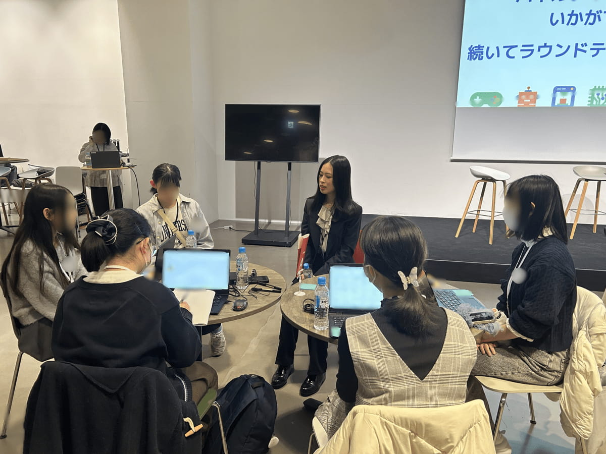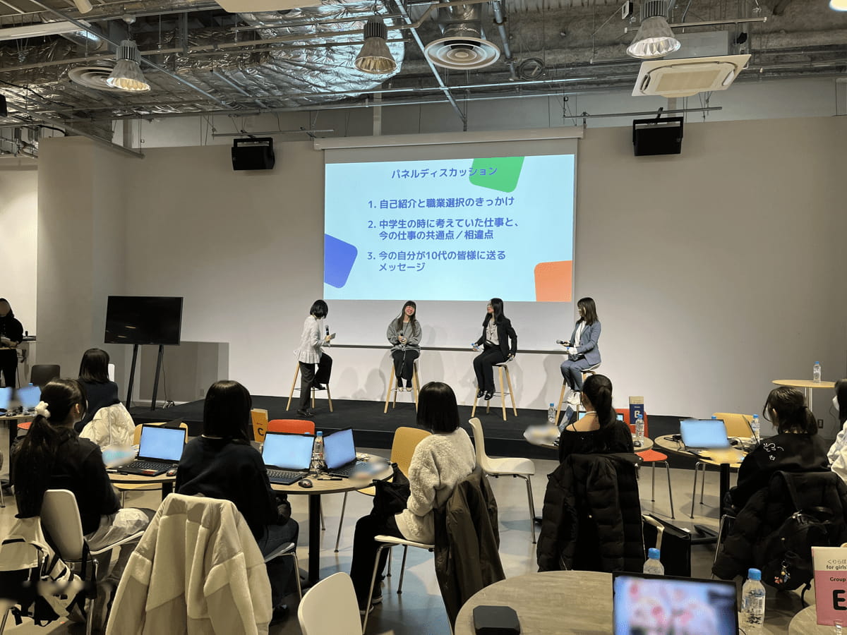当日は、社会で活躍する女性社員のリアルなキャリアに触れる第一部と、生成AIを活用して「10代の日常生活をサポートするチャットボット」を開発する第二部の2部構成で実施しました。参加者と年齢の近い高校生や特定非営利活動法人STEM Leadersの大学生のサポートもあり、世代を超えた交流が自然に生まれ、和やかで活気あふれる雰囲気となりました。