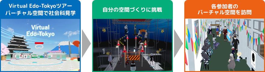 メタバースというインターネット上に構築されたバーチャル空間で、アイテムを自由に組み合わせて理想の空間を作り、自分の分身であるアバターで、もう一つの世界を体験するワークショップです。東京の多彩な魅力を発信する「Virtual Edo-Tokyo※」ツアーに参加し、ツアーで得たインスピレーションをもとに、各自が好みの空間をデザイン。参加者同士がそれぞれの完成した作品を訪問します。